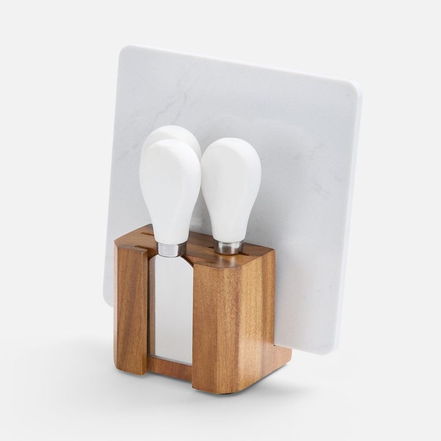 Marmara — компактный сырный набор с мраморной доской и ножами на деревянной подставке. Стильный и удобный, он превращает обычный перекус в маленький гастрономический праздник. Материал: мрамор, дерево, нержавеющая сталь Размеры: доска: 15х15х0,6 см; подставка: 8х7х6,3 см; вилка для сыра: 13х3х1,7 см; нож-лопатка: 12,3х3х1,7 см; листовидный нож: 12х3х1,7 см; упаковка: 15,8х7,6х15,5 см