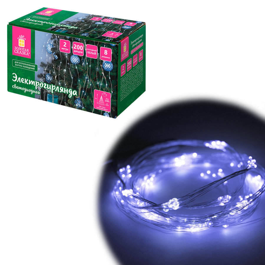 Электрогирлянда-конский хвост комнатная, 2 м, 200 LED, холодный белый, 220 V, ЗОЛОТАЯ СКАЗКА