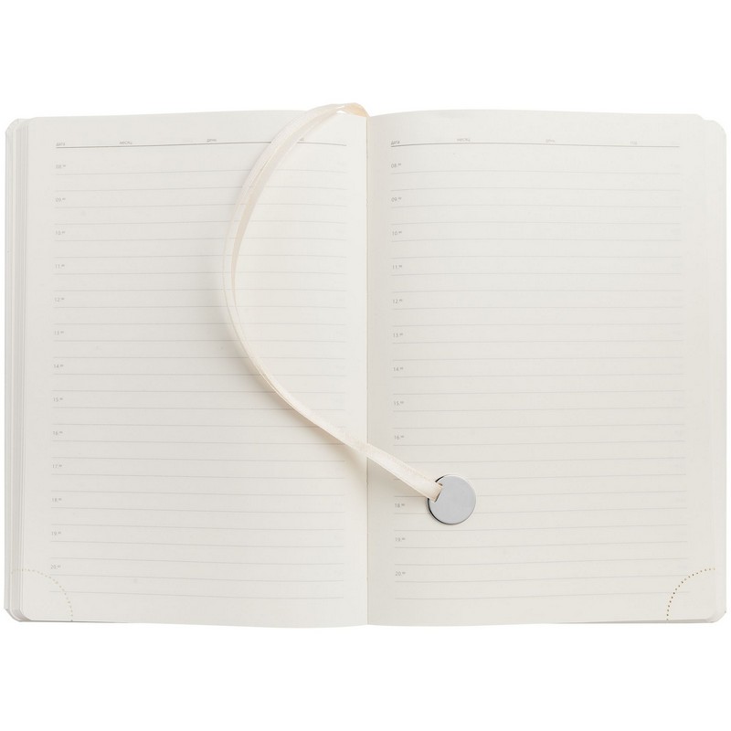 Ежедневник с твердой обложкой, выполнен из материала Winner, белый ВВ, дополнен ляссе в цвет обложки с металлической шильдой. Блок 986:Кол-во страниц — 256; Бумага — тонированная, плотность 70 г/м; Форзац и нахзац — тонированные.