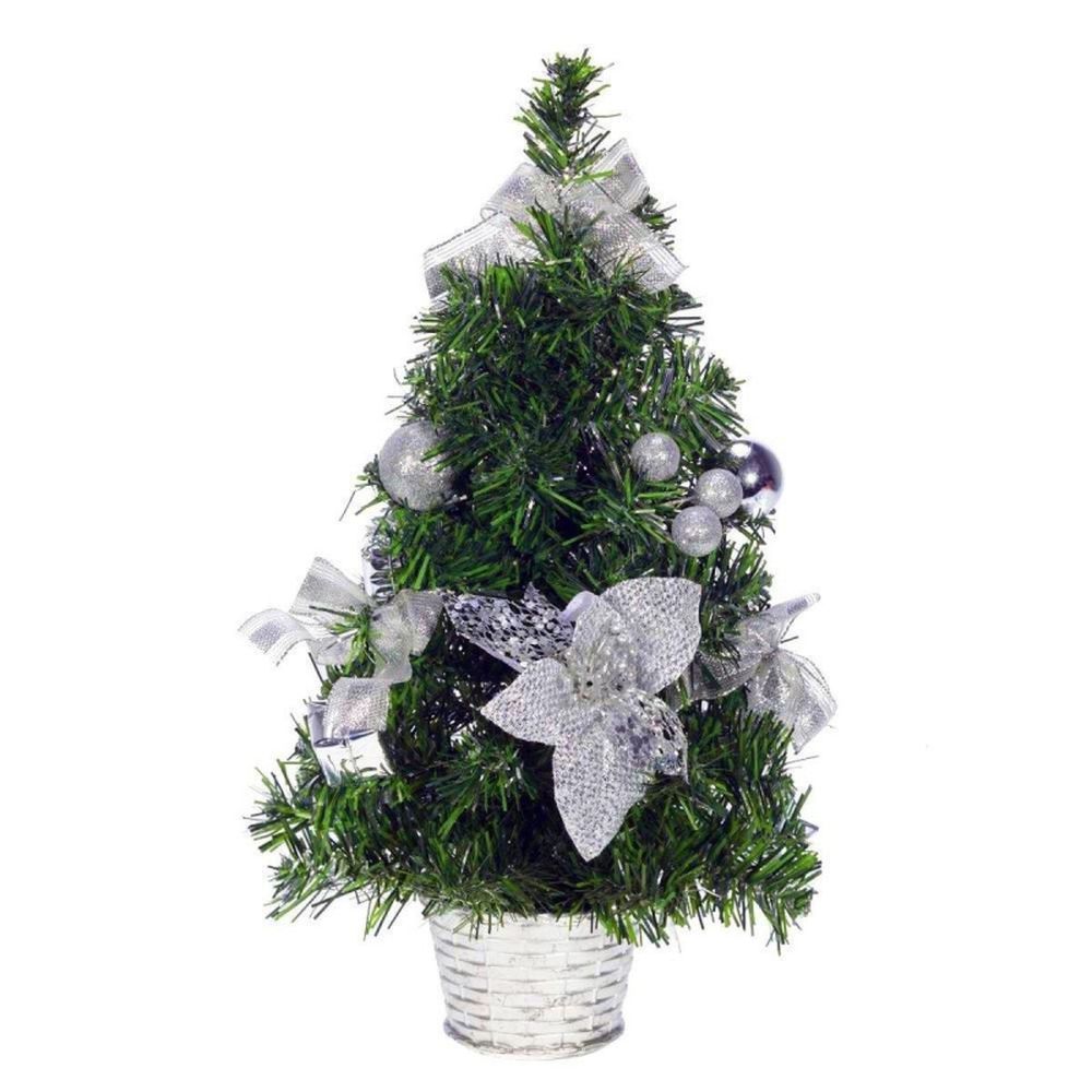 Елка новогодняя Remeco Collection настольная 41 см с декором. Искусственная елка новогодняя настольная с декором из текстильных и полимерных материалов серебристого цвета, не имеет ствола. Хвоя из ПВХ зеленого цвета с накручена на металлическую спираль. Подставка — корзина из пластика. Высота 41 см. Упаковка — пакет.