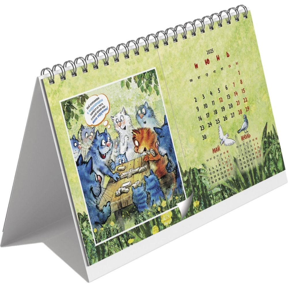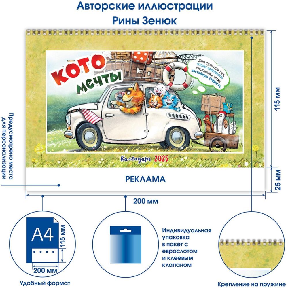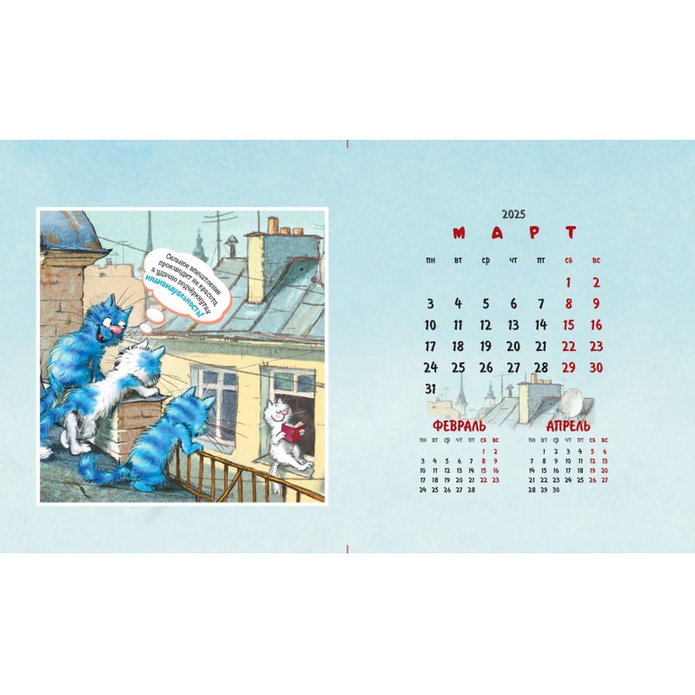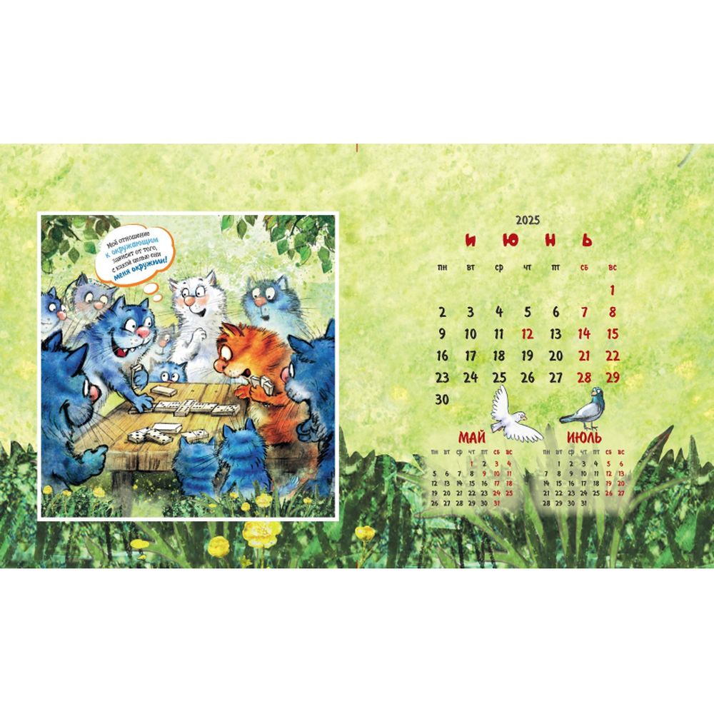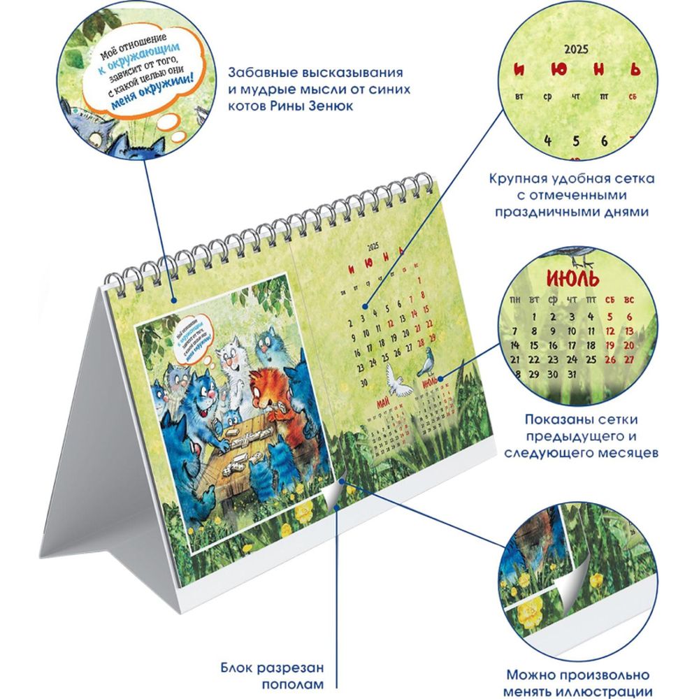 Календарь-домик настольный 200х115 мм, 12 листов + 2 обложки, мелованная бумага 115 гр/м2, разрезная сетка, курсор, пружина, подложка: картон одностороннего мелования 250 гр/м2, место для рекламы 200х25 мм., индивидуальная упаковка в пакет с еврослотом и клеевым клапаном. Яркий календарь с иллюстрациями всенародно любимых синих котов известной художницы Рины Зенюк. Обаятельные котики с удовольствием - и юмором! - делятся своими мыслями и секретами чудесного настроения!