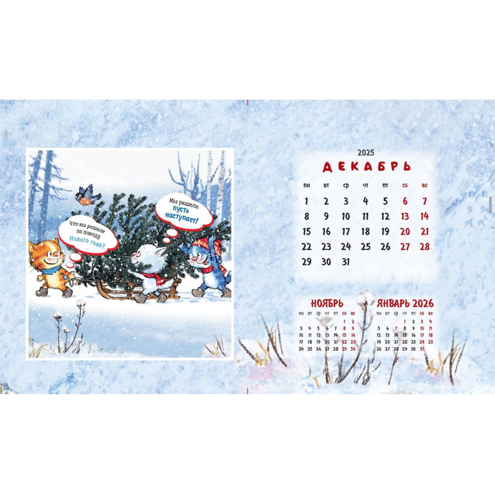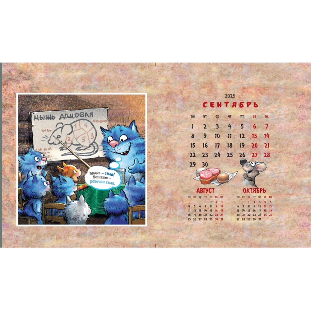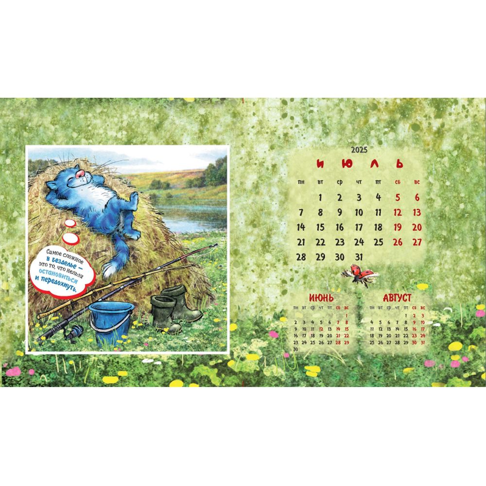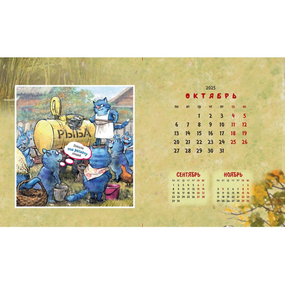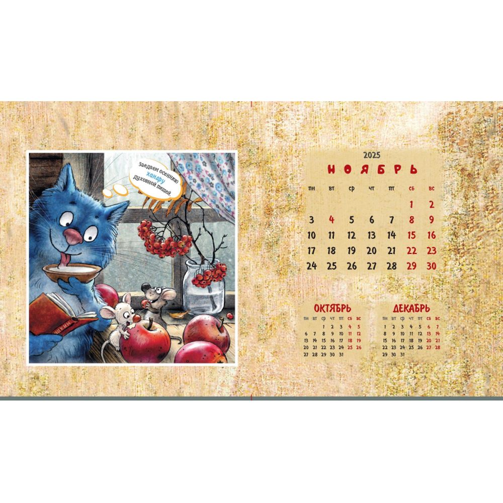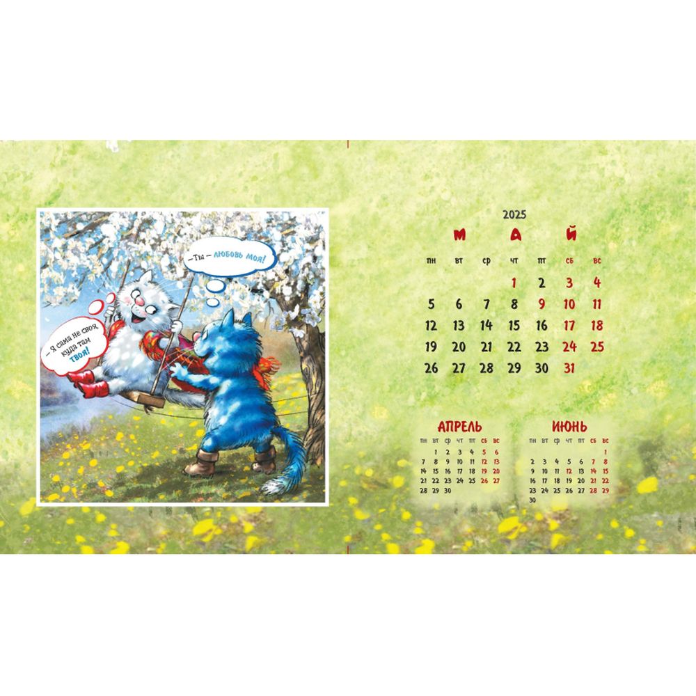 Календарь-домик настольный 200х115 мм, 12 листов + 2 обложки, мелованная бумага 115 гр/м2, разрезная сетка, курсор, пружина, подложка: картон одностороннего мелования 250 гр/м2, место для рекламы 200х25 мм., индивидуальная упаковка в пакет с еврослотом и клеевым клапаном. Яркий календарь с иллюстрациями всенародно любимых синих котов известной художницы Рины Зенюк. Обаятельные котики с удовольствием - и юмором! - делятся своими мыслями и секретами чудесного настроения!