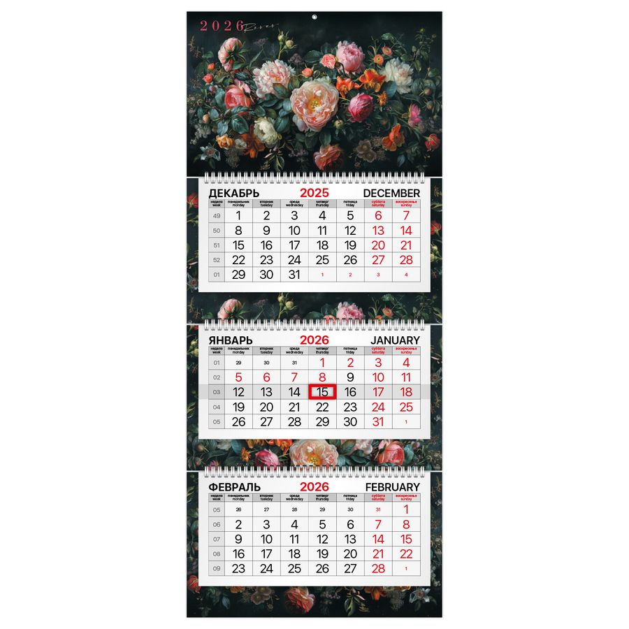 Календарь квартальный 2026 г., 3 блока, 3 гребня, бегунок, мелованная бумага, BRAUBERG PREMIUM, "Цветы"