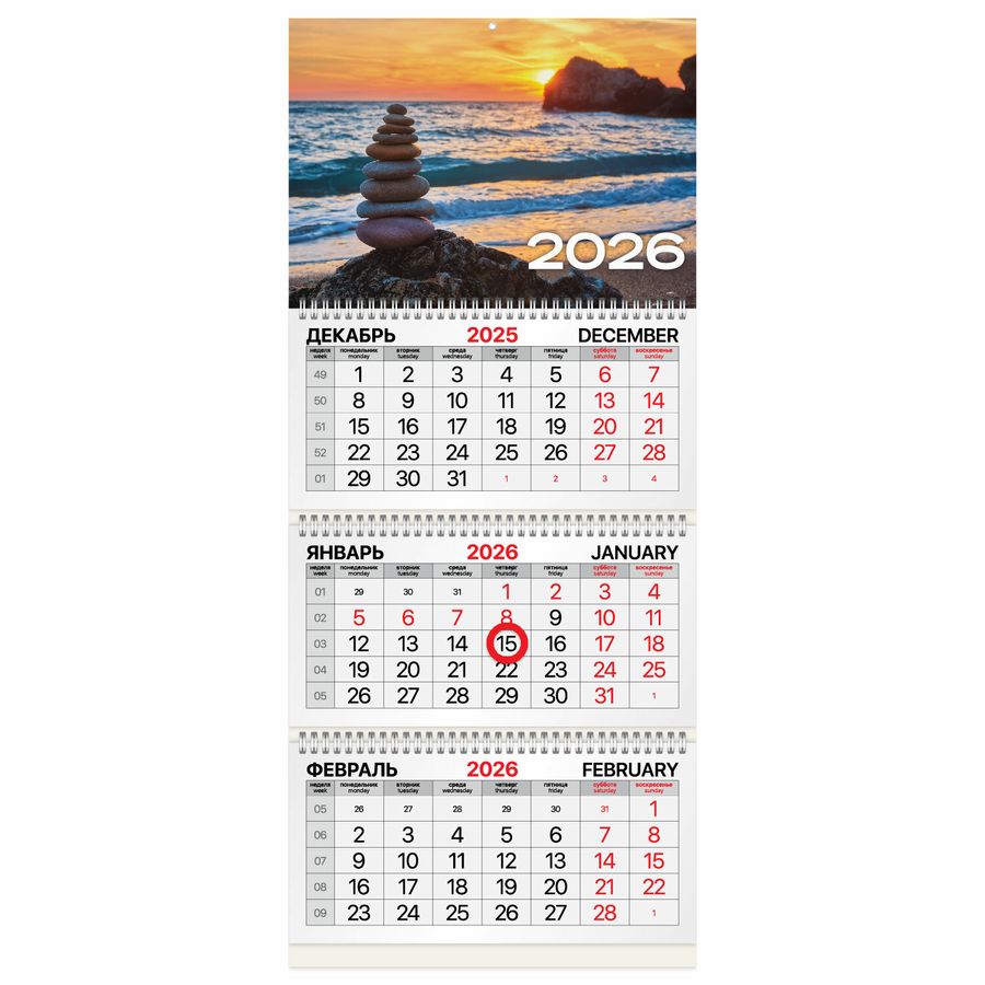 Календарь квартальный 2026 г., 3 блока, 3 гребня, магнитный курсор, мелованная бумага, BRAUBERG, "Закат"