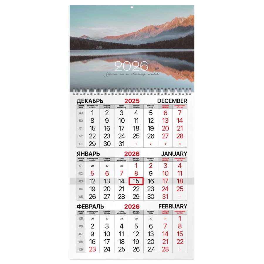 Календарь квартальный на 2026 г., 1 блок, 1 гребень, бегунок, мелованная бумага, BRAUBERG, "Горное озеро"