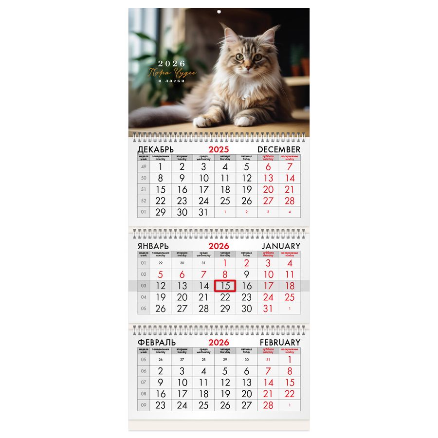 Календарь квартальный на 2026 г., 3 блока, 3 гребня, бегунок, офсет, BRAUBERG, "Кот"