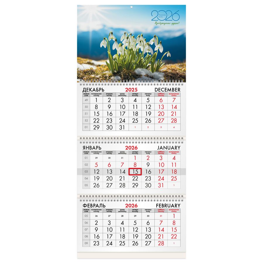 Календарь квартальный на 2026 г., 3 блока, 3 гребня, бегунок, офсет, BRAUBERG, "Подснежники"