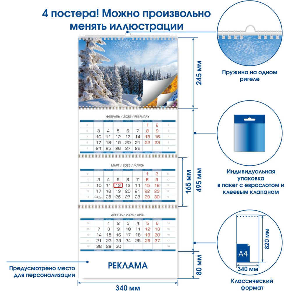 Календарь настенный 3-х блочный 2025 Родные просторы 340х820мм, 4 постера
