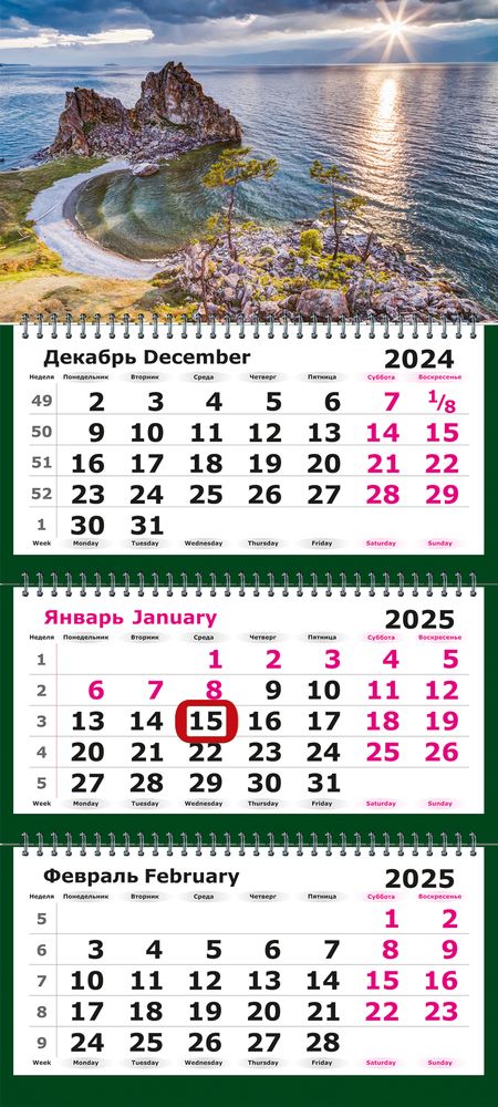 Календарь трехсекционный с магнитным курсором на 2025 год, "Пейзаж Байкал"; формат 290х140, офсет 80 гр., печать в 2 цвета; шпигель - формат 305х195, мелованный картон 300 г/кв.м., подложки 305х160; каждая секция на мет. гребне, общий размер календаря 305х675; с бегунком и люверсом, индивидуальная упаковка, магнитный курсор