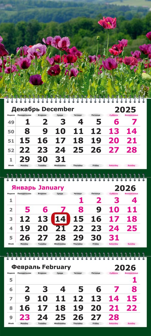 Календарь трехсекционный с магнитным курсором на 2026 год, "Пейзаж. Маковое Поле"; формат 290х140, офсет 80 гр., печать в 2 цвета; шпигель - формат 340х220, целлюлозный картон 350 г/кв.м., печать по фольге, 4+0, УФ-лак; каждая секция на металлическом гребне, общий размер календаря 340х805. ; с бегунком и люверсом, индивидуальная упаковка, магнитный курсор