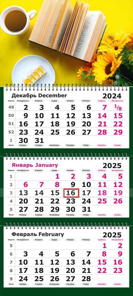 Календарь трехсекционный на 2025 год, "Любимая книга"; формат 290х140, офсет 80 гр., печать в 2 цвета; шпигель - формат 305х195, мелованный картон 300 г/кв.м., подложки 305х160; каждая секция на мет. гребне, общий размер календаря 305х675; с бегунком и люверсом, индивидуальная упаковка