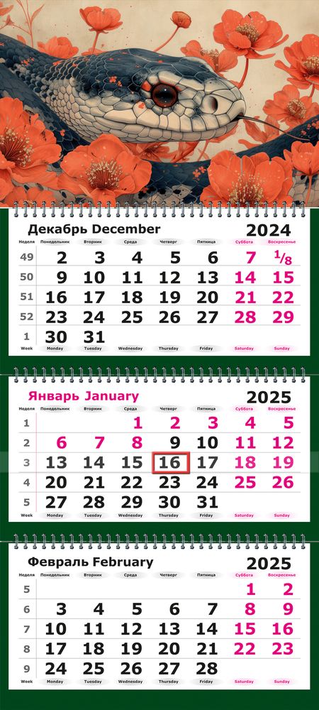 Календарь трехсекционный на 2025 год, "Символ Года. Змея Арт"; формат 290х140, офсет 80 гр., печать в 2 цвета; шпигель - формат 305х195, мелованный картон 300 г/кв.м., подложки 305х160; каждая секция на мет. гребне, общий размер календаря 305х675; с бегунком и люверсом, индивидуальная упаковка