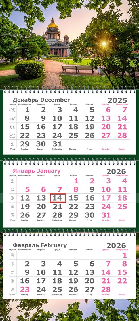 Календарь трехсекционный "Питер. Сквер у Исаакиевского" на 3х гребнях, ПЕРЕВЕРТЫШ на 2026/2027