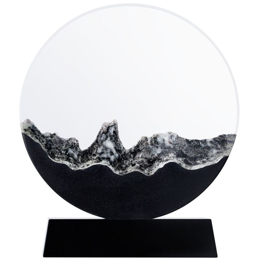 Стела Ridgeway — это уникальное сочетание современного дизайна, высококачественных материалов и особых технологий. Эта награда напомнит об уже пройденном пути и вдохновит на новые свершения. Особенно придется по вкусу работникам горной промышленности или геодезистам. Прозрачная круглая часть и черное основание стелы изготовлены из премиального стекла К9, в основе которого лежит оптическое боросиликатное стекло. Эту марку стекла отличает низкий процент посторонних включений, высокий показатель преломления и высокая прозрачность — идеальные качества для изготовления наград премиального уровня. Нижняя часть стелы выполнена при помощи каменного литья из смеси специальной смолы с кварцевым черным и белым песком, тщательно отшлифованной после спекания при низкой температуре. Такой технологический прием создает завораживающую картинку внутри самой стелы, напоминающую горный хребет: яркий символ как преодоления, так и умиротворения. Гора не кажется неприступной, если смотреть с ее вершины. Материал: стекло Размеры: 17,6х4х20,3 см; упаковка: 25,5х23,2х6,4 см
