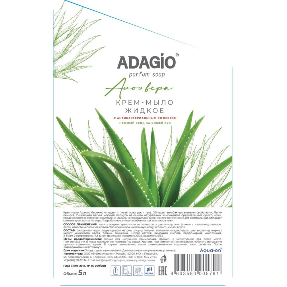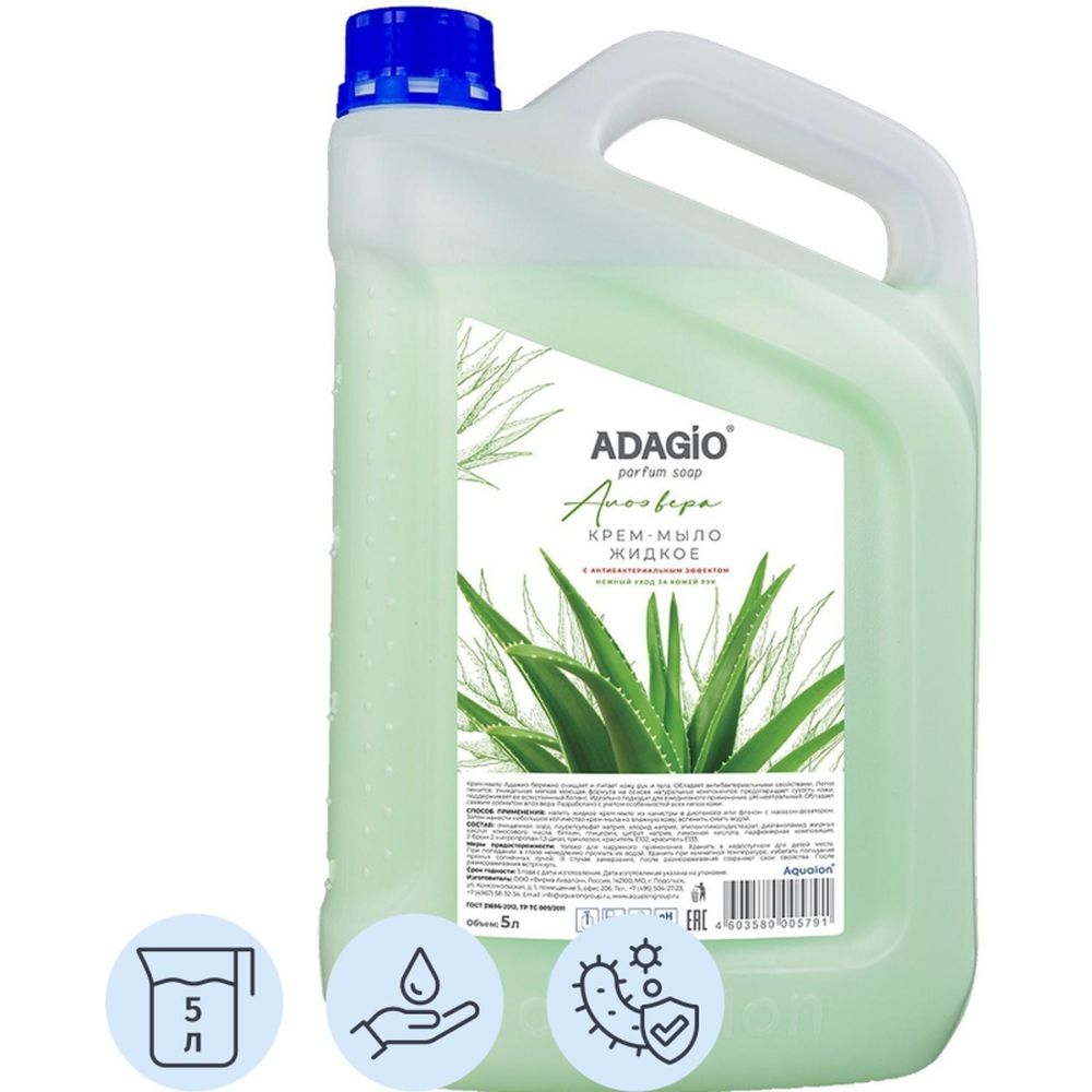 Жидкое мыло «Адажио. Алоэ вера» в канистре объемом 5 литров. Удобно наливать во флакон с дозатором. Имеет приятный аромат, кремовая основа ухаживает за кожей рук и тела. Эффективно очищает и дезинфицирует. Содержит антибактериальный компонент (триклозан), который оказывает антисептическое действие и защищает от образования новых бактерий. Мыло жидкое (5 л) подходит для ежедневного использования.
