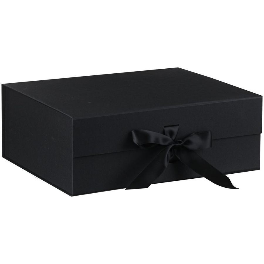 Коробка из переплетного картона, кашированного тонированной в массе крафтовой бумагой. Крышка на двух магнитах дополнительно фиксируется репсовой лентой. Материал: переплетный картон Размеры: 33x27x12 см