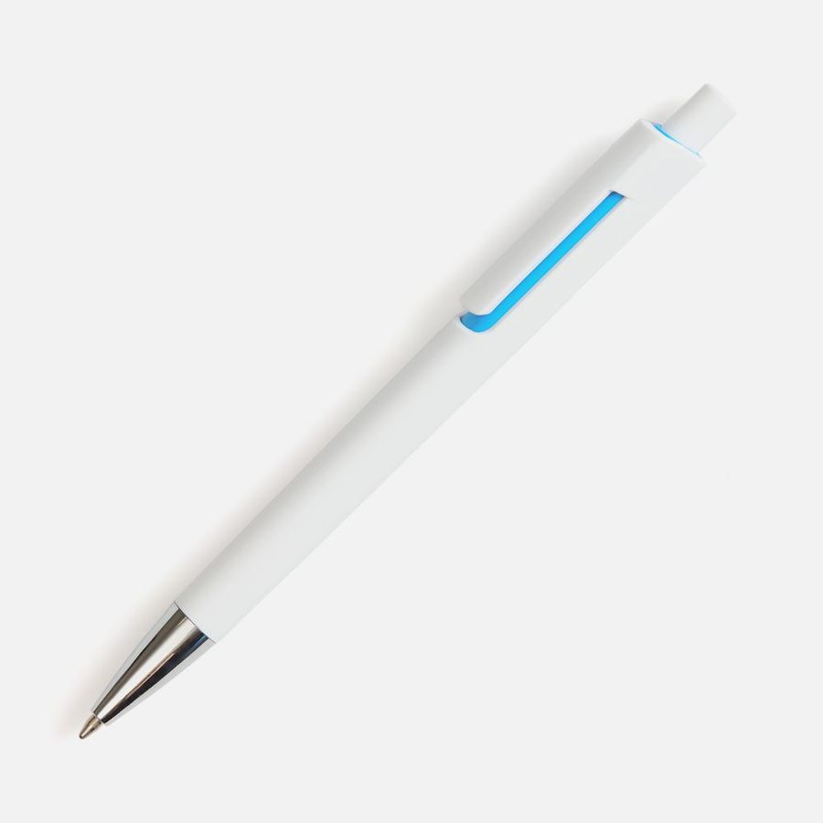 Шариковая ручка с глянцевым белым корпусом и цветовым акцентом у клипа, который дополнит логотип компании. Материал: пластик Размеры: 14,1х1,1 см