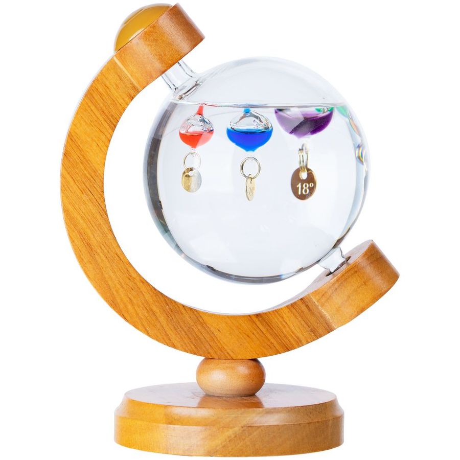 Термометр Галилео оригинальной формы, напоминающей глобус, добавит индивидуальности домашнему или офисному интерьеру. В основе его работы лежит физическая закономерность, впервые отмеченная великим Галилео Галилеем: плотность жидкости увеличивается при снижении температуры и уменьшается при ее повышении. И теперь стеклянные шарики в жидком парафине не только радуют глаз, но и позволяют с легкостью определить температуру в помещении. Материал: дерево, стекло Размеры: 9х13х17,5 см, диаметр шара 10 см; коробка: 24,2x15x18,5 см