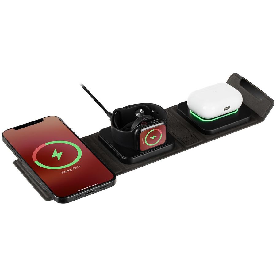 triFlex — компактное устройство беспроводной зарядки для самых мобильных и современных пользователей. Станцию легко свернуть в аккуратный бокс, поэтому ее удобно использовать не только в офисе, но и находясь в дороге — подзарядка может понадобиться где угодно. Встроенная подсветка добавит изюминки к лаконичному дизайну устройства. Зарядная станция совместима со всеми смартфонами, поддерживающими технологию беспроводной зарядки Qi. Также предусмотрено место для зарядки часов Apple Watch и наушников. Зарядка начнется автоматически при размещении устройств на индукционной площадке. Материал: полиуретан, пластик Размеры: 33x8,2x1,5 см, в сложении: 8,3х8,2х3,1 см; упаковка: 15,8x11,2x4,8 см