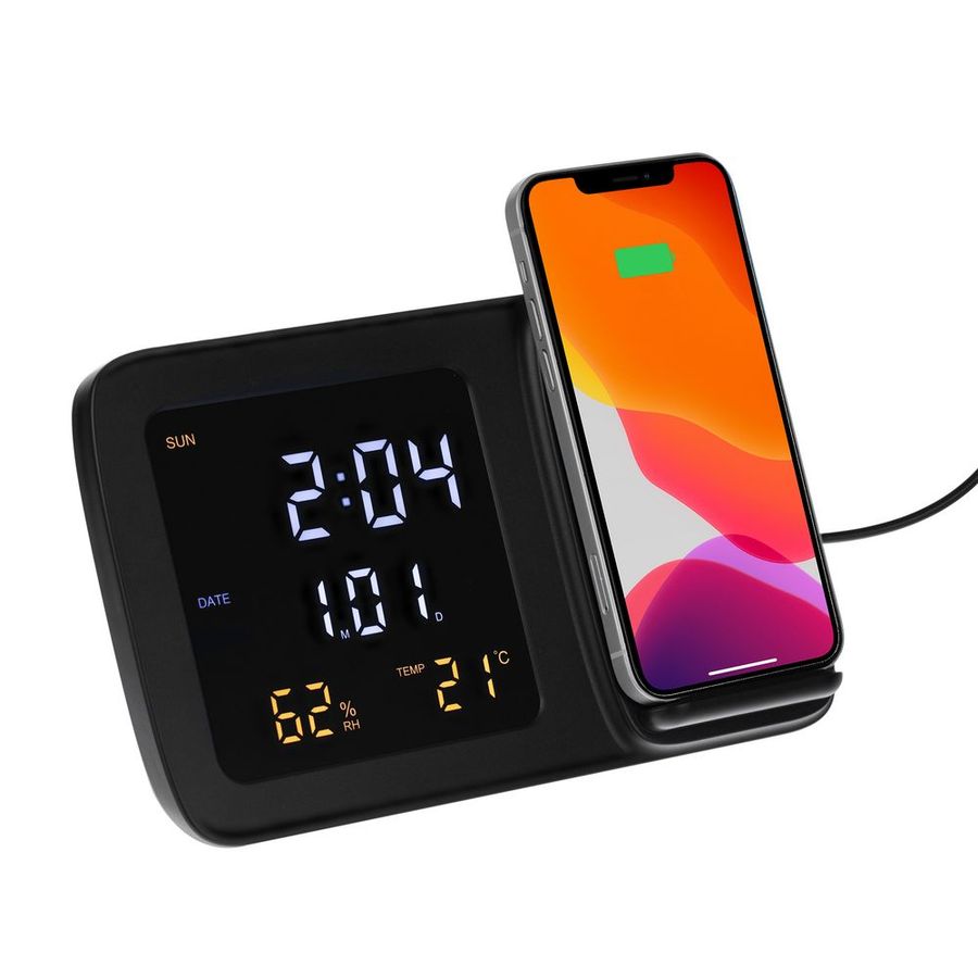 Станция беспроводной зарядки с часами и календарем и подсветкой логотипа Novem черная